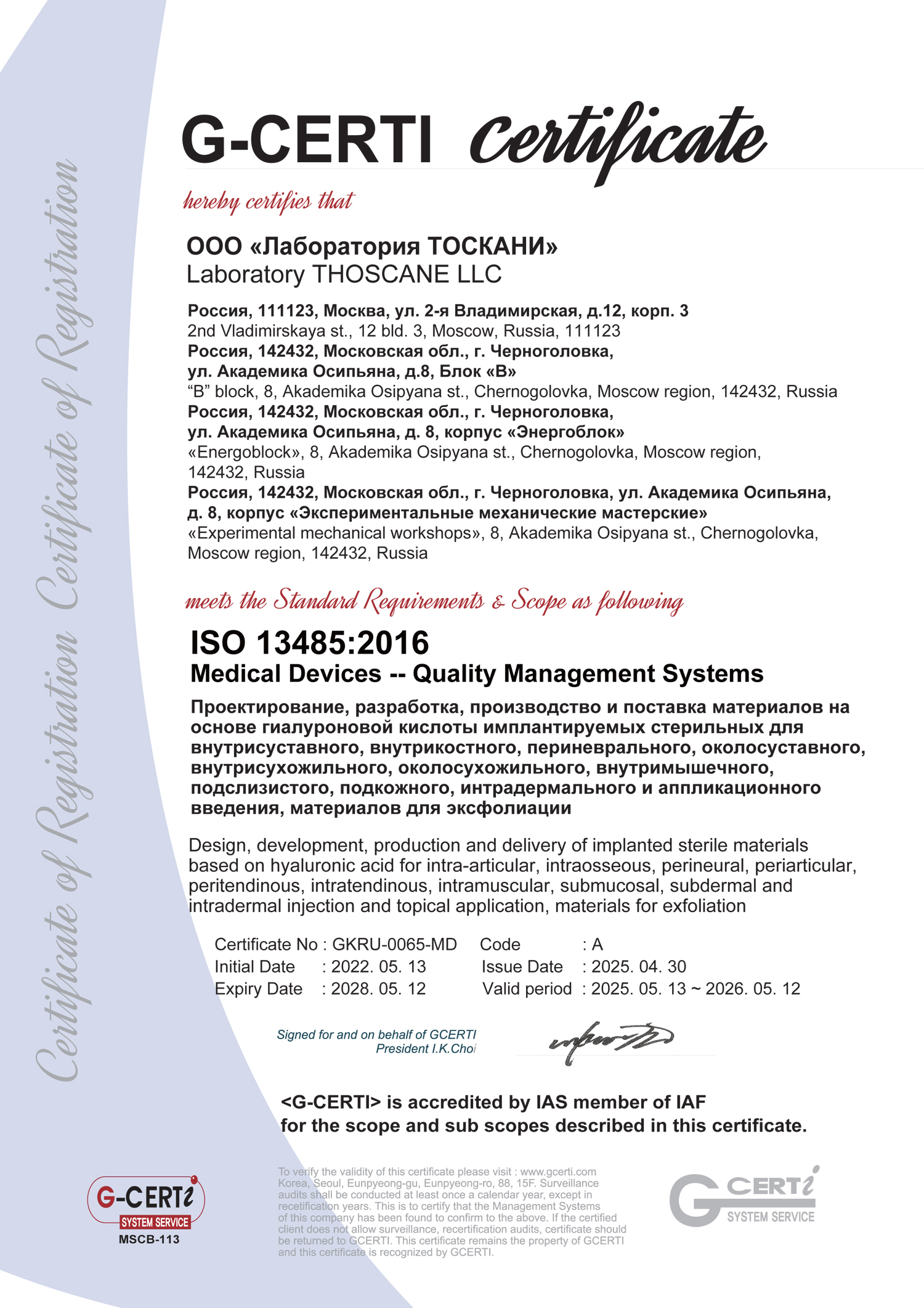 «Лаборатория ТОСКАНИ» успешно прошло надзорные аудиты на соответствие требованиям международным стандартам ISO и GMPООО «Лаборатория ТОСКАНИ» успешно прошло надзорные аудиты на соответствие требованиям международному стандарту ISO 13485:2016 (ГОСТ ISO 13485-2017) для производства медицинских изделий и GMP для производства парфюмерно-косметической продукции, соответствующей международному стандарту ISO 22716:2007 (ГОСТ ISO 22716-2013).