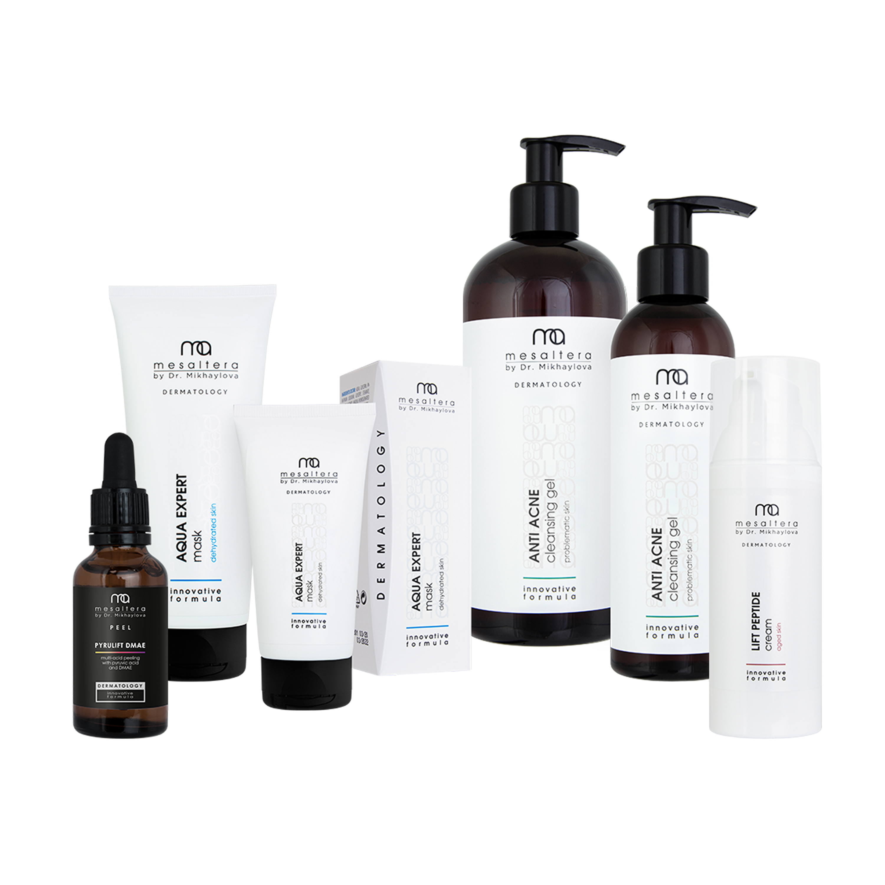 Космецевтическая линия средств MESALTERA by Dr. Mikhaylova Инновационная космецевтическая линия средств, в основе которой лежат собственные научные разработки Натальи Михайловой и передовые технологии мировых лабораторий. Это первая линия космецевтики нового поколения, созданная на базе производства инъекционных препаратов имеющих регистрацию медицинских изделий в соответствии с высочайшими мировыми стандартами. Более чем 15-летний опыт работы Михайловой Натальи в ее клинике с клиентами позволил ей создать уникальную линию средств направленных на решение всех эстетических проблем кожи. Большой практический опыт работы с инъекционными и лазерными методиками позволили разработать космецевтическую линию, эффективность которой сравнима с результатами инъекционных технологий и химических пилингов, отсюда название бренда MESALTERA – «альтернатива мезо препаратов». Линия средств предназначена для тех, кто хочет получить быстрый выраженный результат или же усилить эффективность лазерных методик, ботулинотерапии, мезотерапии, химических пилингов и др. Разработана линия средств для быстрого восстановления кожи после агрессивных процедур, таких как: лазерные шлифовки, пластическая хирургия, микродермабаразия и др. Преимущества косметики Mesaltera