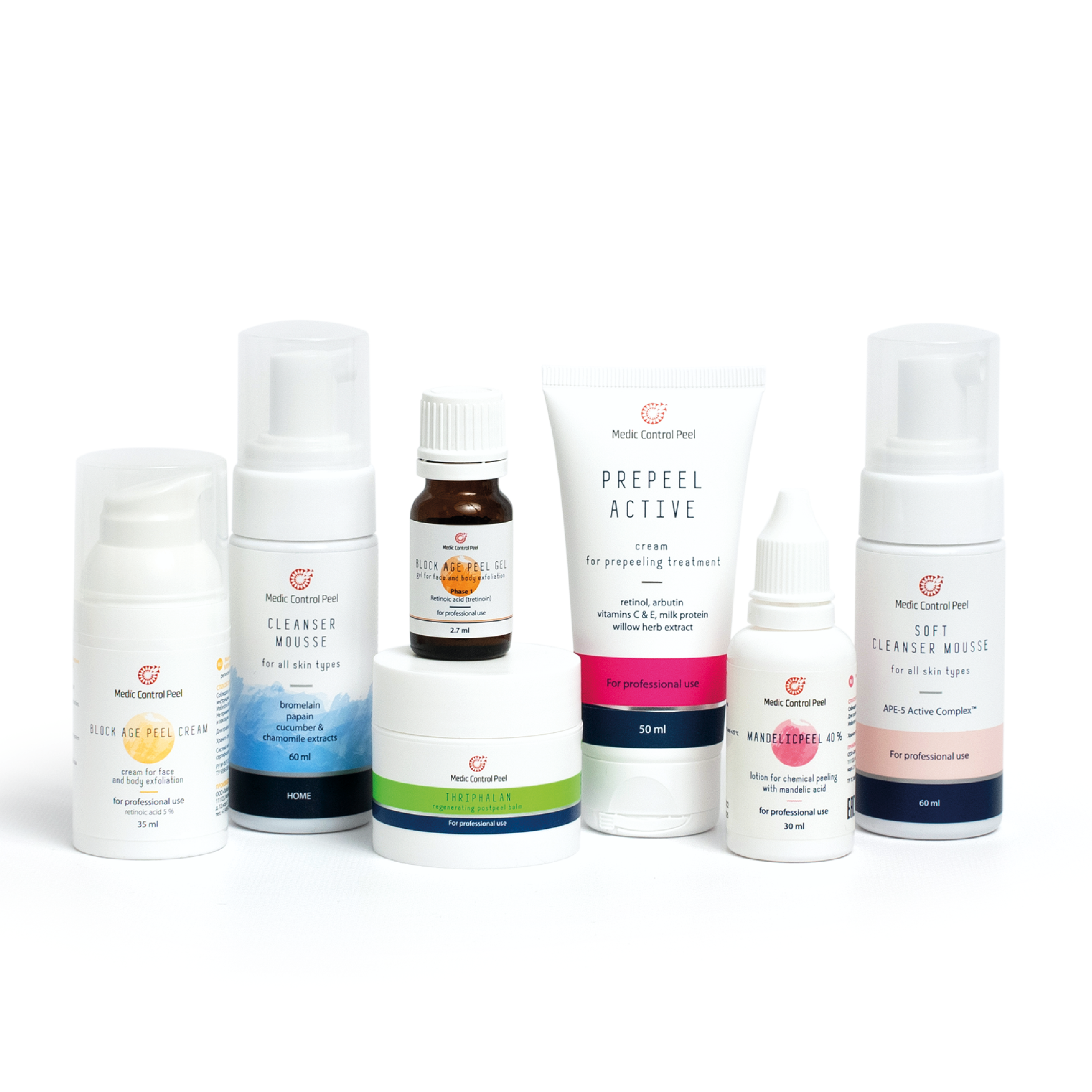 Линия для проведения химических пилингов различной глубины воздействия. Включает в себя гликолевые, миндальные, молочные, пировиноградные, салициловые, Джесснера, трихлоруксусные, а также ретиноевые (желтые) пилинги. Препараты отличают оптимальные, для получения выраженного клинического эффекта, концентрации кислот, значений рН, формы выпуска пилинговых составов (крем, гель, лосьон), продуманные рецептуры, а также лучшие активные ингредиенты, применяемые для их производства.