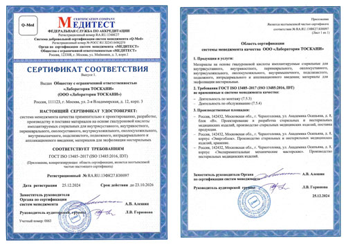 В апреле 2025 г. ООО «Лаборатория ТОСКАНИ» успешно прошло ресертификационный аудит на соответствие требованиям ISO 13485:2016 в южнокорейском органе по сертификации G-CERTI System Service, имеющем международную IAF аккредитацию. Сертификаты соответствия, зарегистрированные системе IAF, имеют признание практически во всех странах мира.