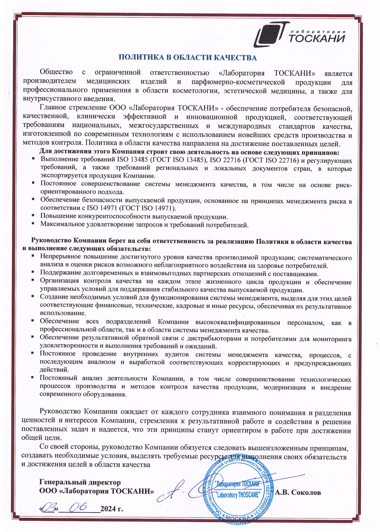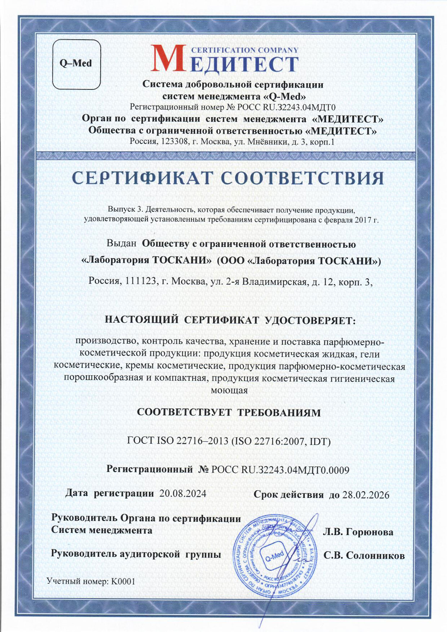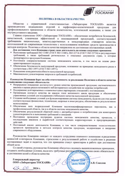 Начиная с 2012 г. ООО «Лаборатория ТОСКАНИ» активно внедряет и поддерживает развитие системы менеджмента качества, отвечающую требованиям международного стандарта ISO 13485:2016 (ГОСТ ISO 13485-2017) для производства медицинских изделий и GMP для производства парфюмерно-косметической продукции, соответствующей международного стандарта ISO 22716:2007 (ГОСТ ISO 22716-2013).