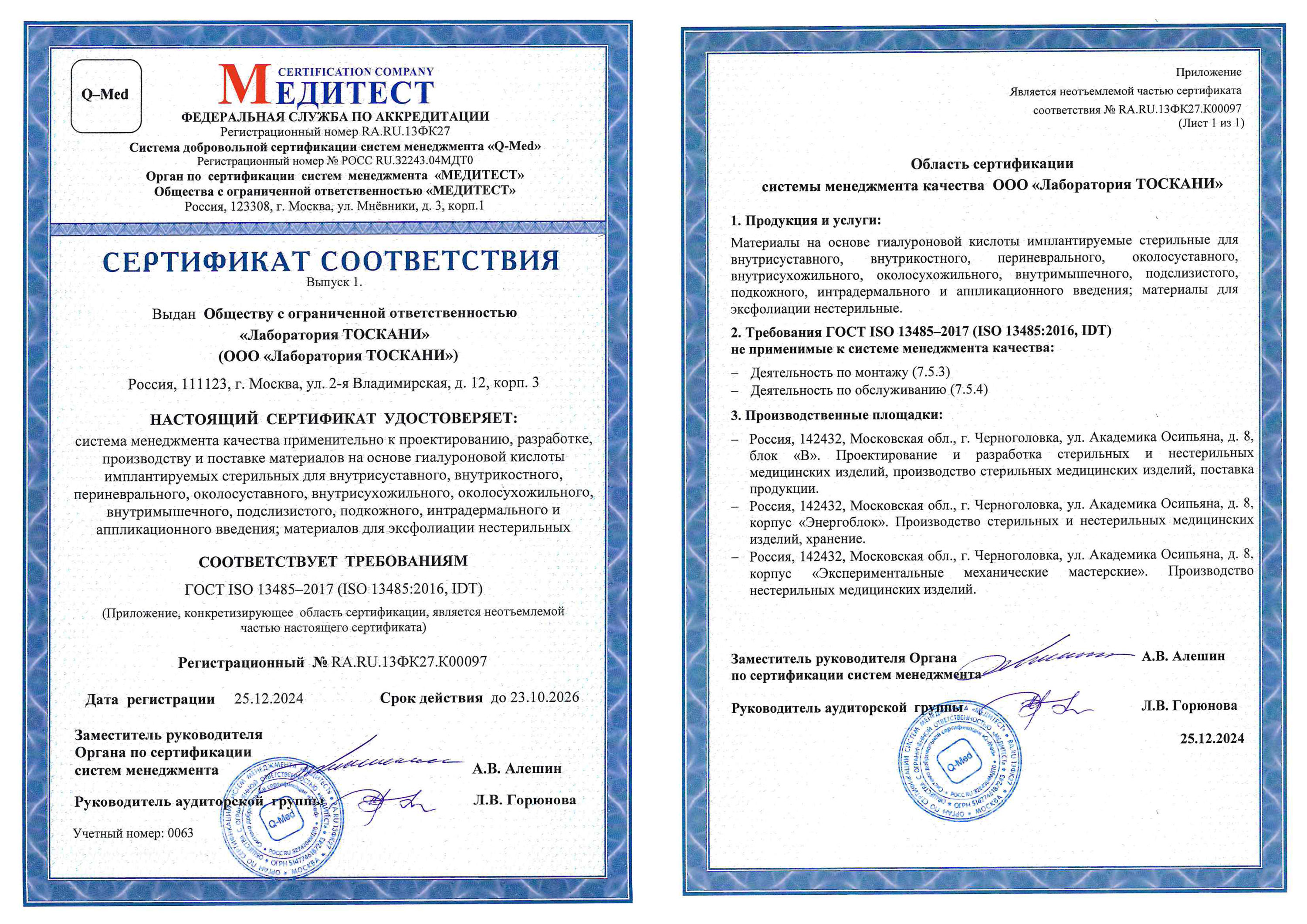 Действующие сертификаты соответствия, представленные ниже, подтверждают соответствие требованиям международных стандартов ISO 13485:2016 (ГОСТ ISO 13485-2017) «Изделия медицинские. Системы менеджмента качества. Требования для целей регулирования» и ISO 22716:2007 (ГОСТ ISO 22716-2013) «Продукция парфюмерно-косметическая. Надлежащая производственная практика (GMP). Руководящие указания по надлежащей производственной практике».